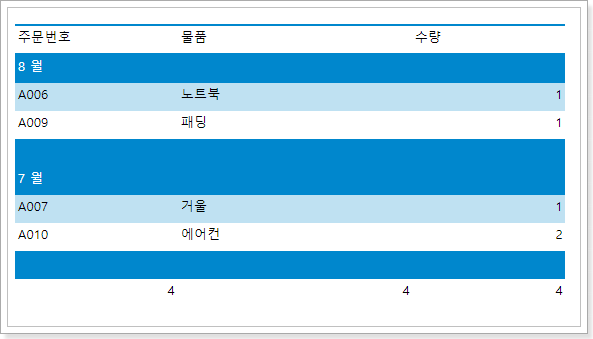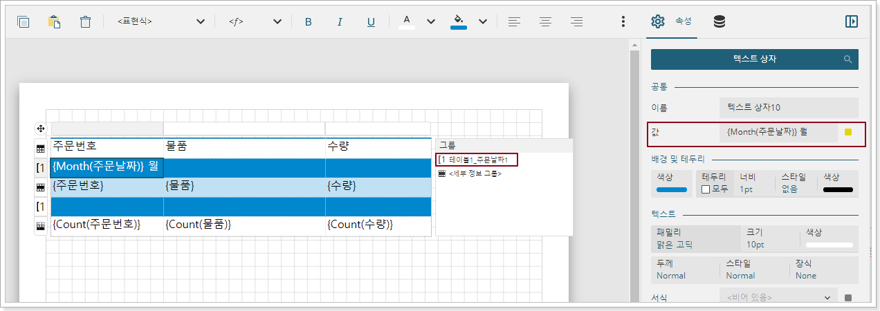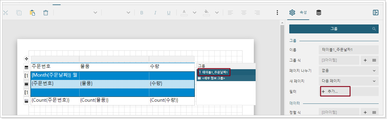 데이터 정렬을 테이블의 그룹화 기준으로 설정하고, "{Month(주문 날짜)}" 표현식으로 설정하고, 오름차순으로 정렬합니다.
