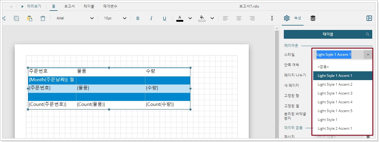 테이블을 선택하여 속성 설정 패널에서 테이블의 모양 스타일을 조정합니다.