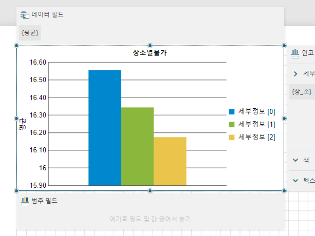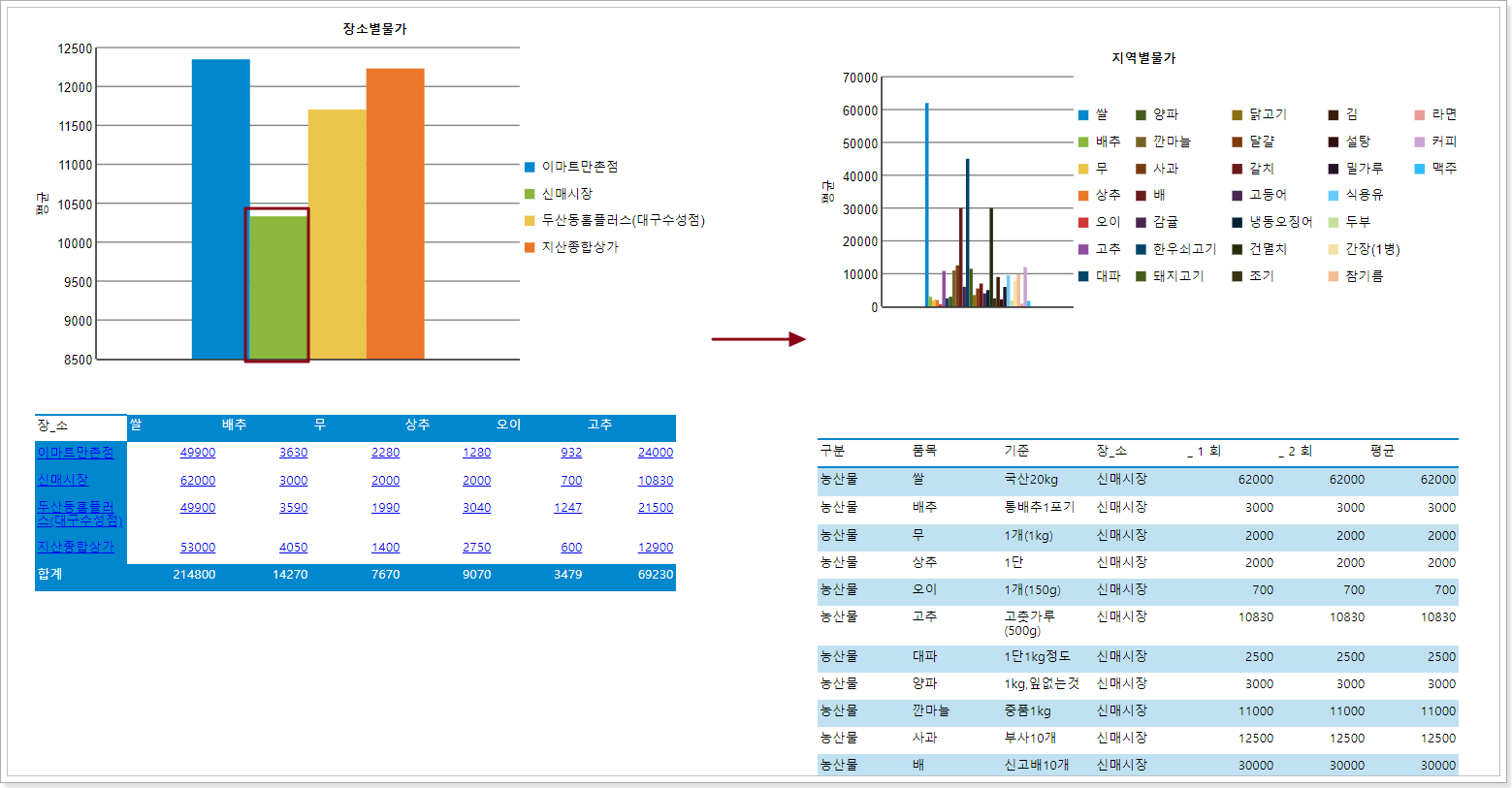 다음 그림에서 기본 보고서는 장소별 물가내역이고 장소 클릭하면 해당 지역의 특정 물가 정보를 볼 수 있습니다.