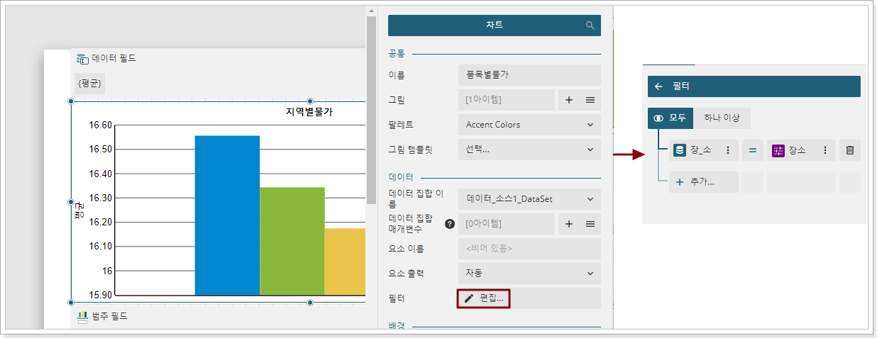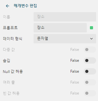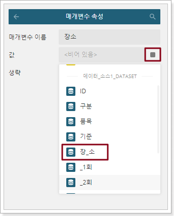 [항목 추가]를 클릭한 후 [장소]라는 매개 변수를 설정한 다음 매개 변수 뒤에 있는 설정 버튼을 클릭하여 다음 그림과 같이 매개 변수 값 데이터를 장소로 지정합니다.![]()