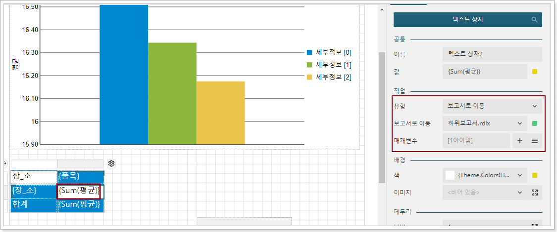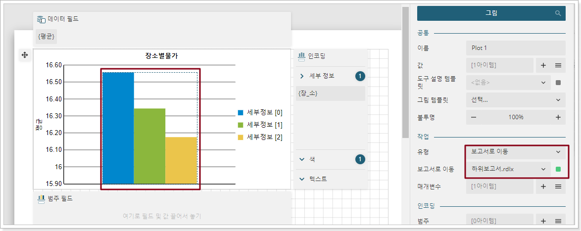 드릴 관계를 설정합니다. 기본 보고서를 열고 편집 상태로 이동하여 차트의 도면 영역을 선택합니다. 드릴스루 작업 섹션에서 드릴 유형을 보고서로 이동을 선택하고 점프 대상 보고서를 하위 보고서 드릴스루 하위 보고서로 지정합니다( 아래 그림 참조).