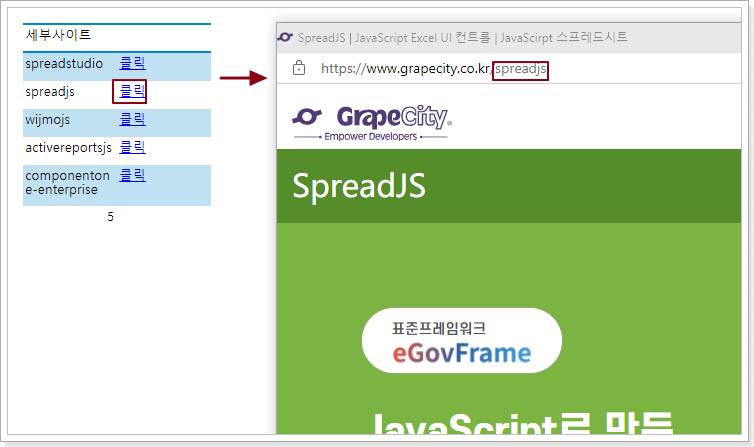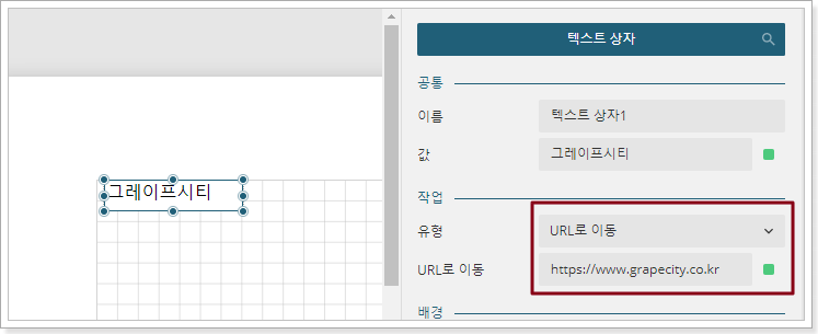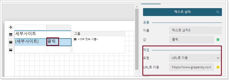 텍스트 상자 구성 요소를 선택하고 속성 설정 패널에서 드릴스루 옵션을 찾습니다. 드릴 유형을 URL로 이동으로 설정하고 URL을 포도 시티 웹 사이트의 웹 사이트 https://www.grapecity.co.kr 설정합니다.