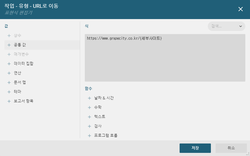 표현식 편집기에 표현식(https://www.grapecity.co.kr/{세부사이트}) 을 입력하고 저장합니다.