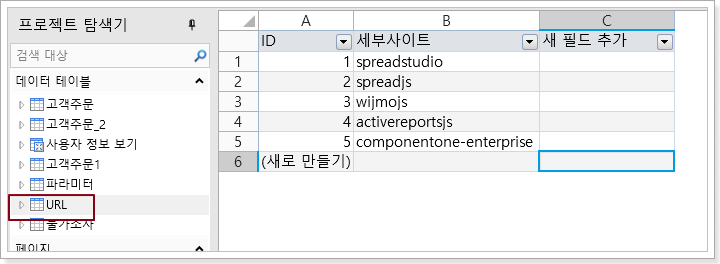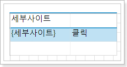 테이블 구성 요소를 만들고, 필드 "세부사이트"를 바인딩하고, 두 번째 열에 "클릭"을 입력합니다. 테이블의 세 번째 열을 삭제하고 너비를 조정합니다.