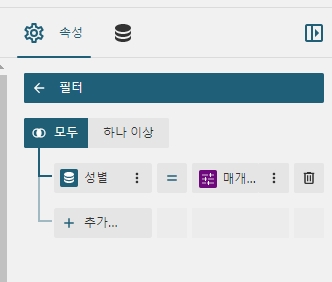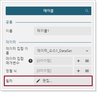 데이터 필터를 추가합니다. 전체 테이블 구성 요소를 선택하여 속성 설정 패널을 엽니다. [데이터 필터] 항목 뒤에 있는 [필터 추가]를 클릭합니다.