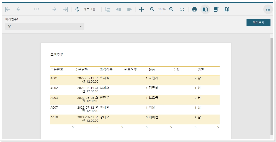 보고서를 미리 봅니다. 매개변수 패널에 "남" 입력한 후 미리 보기를 클릭합니다.