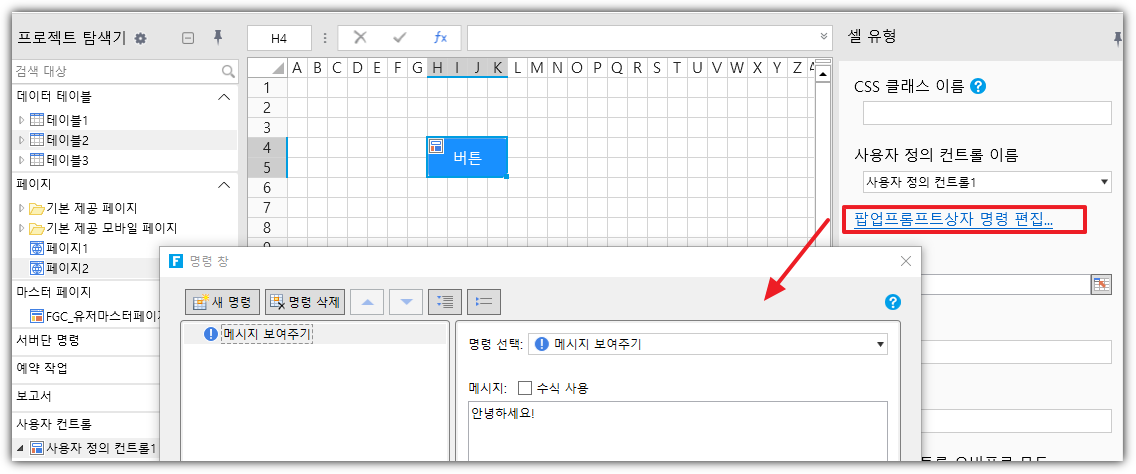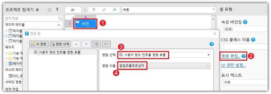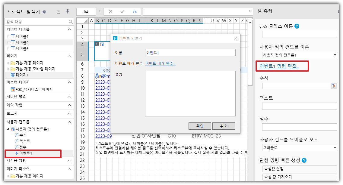 사용자컨트롤에 대한 이벤트를 생성하고 페이지에서 사용자컨트롤를 적용한 후 오른쪽 셀 설정에서 이벤트의 명령을 편집할 수 있습니다.