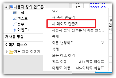 사용자컨트롤를 선택하고 우클릭 후 우클릭 메뉴에서 "새 페이지 만들기"를 선택하면 이벤트 생성 대화상자가 팝업된다.