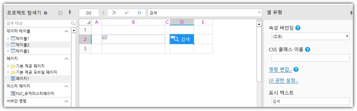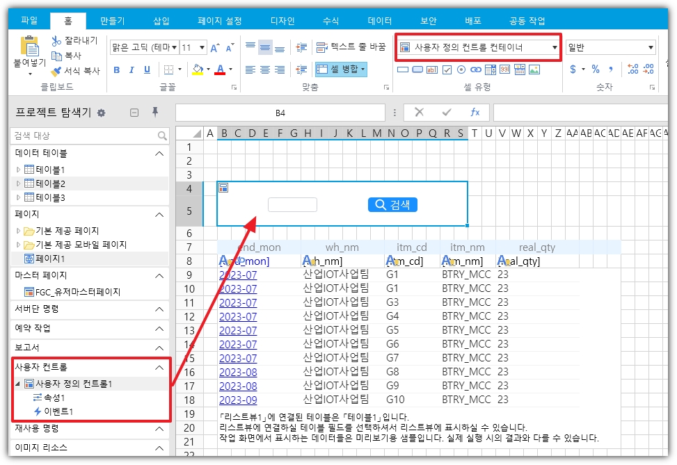 또는 셀 영역을 선택한 후 해당 셀 유형을 사용자 정의 컨트롤로설정한 후 오른쪽 셀 설정에서 컴사용자 정의 컨트롤 이름을 선택합니다.