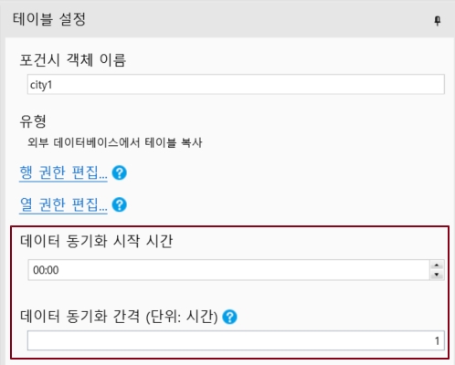 테이블 설정에서 동기화 시작 시간과 동기화 간격을 설정하는 연결된 테이블 복사본을 엽니다. 동기화 간격은 1분 이상이어야 합니다.