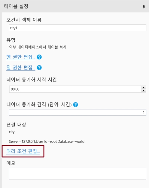 연결 테이블 복사본을 열고 테이블 설정에서 쿼리 조건 편집을 클릭합니다.