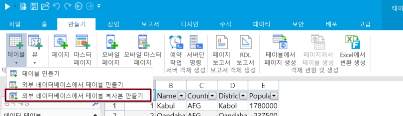리본 메뉴 모음에서 [만들기]>[테이블]>[외부 데이터베이스에서 테이블 복사본 만들기]를 선택합니다