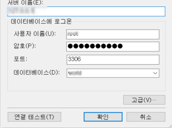 서버 이름, 사용자 이름, 암호, 포트 번호를 입력한 후 데이터베이스를 선택합니다.