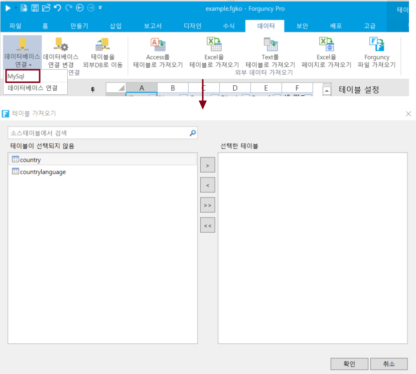 [확인]을 클릭하면 [테이블 가져오기] 대화 상자가 나타나고, 데이터 소스의 테이블 목록에서 가져올 테이블을 선택하고, [>]를 클릭하여 선택한 테이블을 선택한 테이블 목록으로 이동하거나, [>>]을 클릭하여 데이터 소스의 테이블을 선택한 테이블 목록으로 이동합니다.