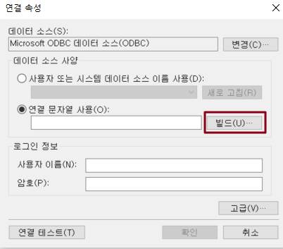데이터 소스 사양에서 연결 문자열 사용을 선택하고 빌드를 클릭합니다.
