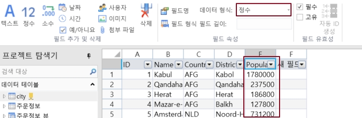데이터 테이블 앞의 확장 필드를 클릭하고 [Population] 필드를 선택한 후 마우스 오른쪽 단추로 클릭하고 마우스 오른쪽 버튼 클릭 메뉴에서 [열 유형 다시 가져오기]를 선택하면 연결 데이터 테이블에서 필드 유형을 다시 가져오고 데이터 테이블을 새로 고칩니다.