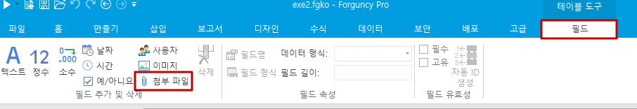 방법 2. 데이터 테이블을 열고 리본 메뉴에서 테이블 도구 필드를 선택하고 첨부 파일 유형 버튼을 클릭합니다.