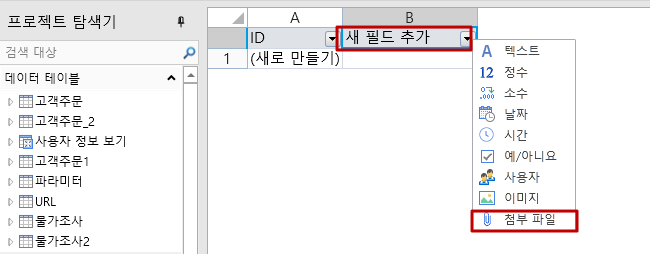 데이터 테이블에 첨부 파일 데이터를 저장할 첨부 파일 필드를 추가할 수 있습니다.