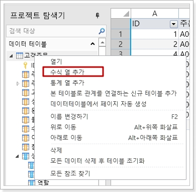 데이터 테이블을 선택하고 마우스 오른쪽 버튼을 클릭하여 팝업 메뉴에서 [수식 추가]를 선택합니다.