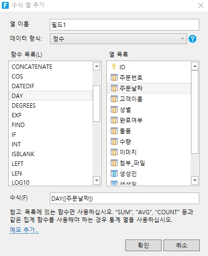 수식 열 추가 필드 대화 상자에서 필드 이름을 입력하고 데이터 형식을 선택한 다음 함수 및 필드 목록에서 함수와 필드를 두 번 클릭하여 아래 수식 편집 상자에서 수식을 편집합니다.