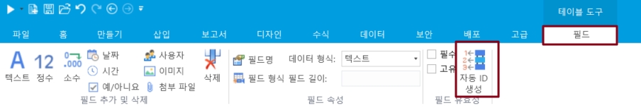 데이터 테이블을 열면 리본 메뉴에서 테이블 도구 필드를 선택하여 필드를 자동 ID 생성을 할 수 있습니다. 필드 유형이 텍스트인 경우에만 자동 ID 생성을 설정할 수 있습니다.