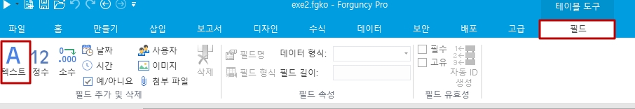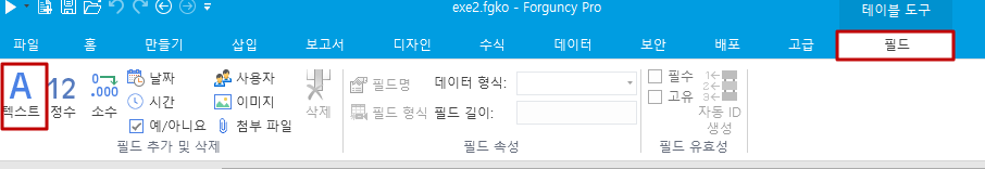 방법 2.데이터 테이블을 열고 리본 메뉴에서 테이블 도구 필드를 선택하고 텍스트 유형의 버튼 클릭합니다. [텍스트]를 클릭하면 데이터 테이블에 텍스트 필드가 추가되고 필드 이름을 변경하고 데이터를 추가할 수 있습니다.