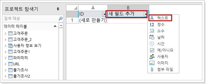 방법 1. 데이터 테이블에서 첫 번째 행의 마지막 셀(필드 추가)의 드롭다운 버튼을 클릭하여 드롭다운 목록에서 텍스트 필드 유형을 선택합니다.