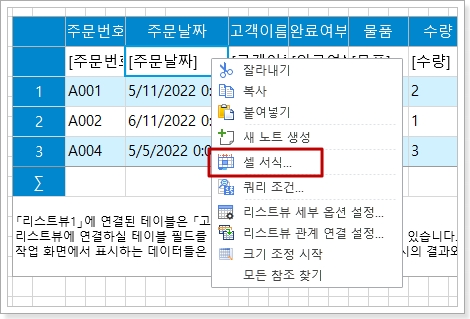 테이블에서 필드를 마우스 오른쪽 버튼을 클릭하고 팝업 메뉴에서 [셀 서식]을 선택합니다.