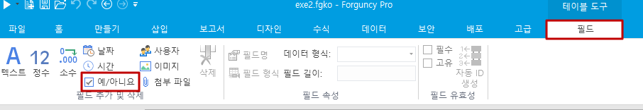 방법 2. 데이터 테이블을 열고 리본 메뉴에서 테이블 도구 필드를 선택하고 여부 유형의 버튼을 클릭합니다.