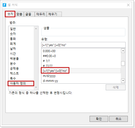 [셀 서식 지정] 대화 상자의 [숫자] 탭에서 분류를 [사용자 정의]로 선택하고 [=1]"yes",[=0]"no"를 선택합니다.