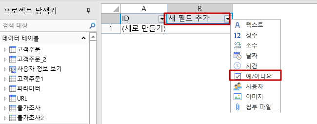 방법 1. 데이터 테이블에서 첫 번째 행의 마지막 셀(필드 추가)의 드롭다운 버튼 클릭하여 드롭다운 목록에서 유형을 선택합니다.