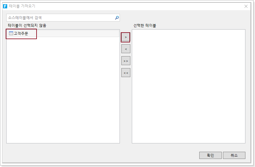 가져올 테이블을 선택하고 데이터 소스의 테이블을 선택한 테이블 영역으로 이동하려면 누릅니다.![]()