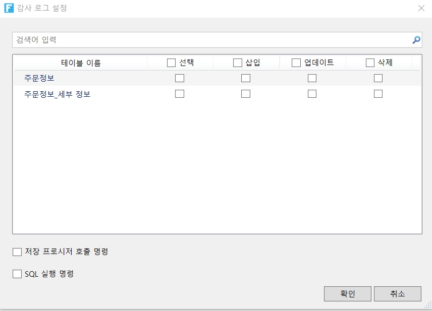 감사 로그 설정 대화 상자에서 감사 로그를 설정할 데이터 테이블을 선택한 후 쿼리, 추가, 편집 및 삭제합니다.