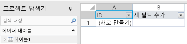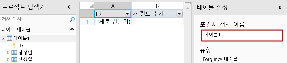 데이터테이블영역에서 테이블 1을 볼 수 있습니다.