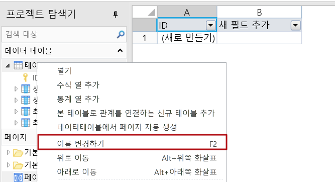 방법 2.데이터 테이블을 선택하고 마우스 오른쪽 버튼을 클릭하고 팝업 메뉴에서 [이름 변경하기]를 선택하여 데이터 테이블의 이름을 바꿉니다.