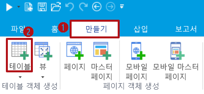 방법 1. 리본 메뉴 모임에서 [만들기]> [테이블]을 선택합니다.
