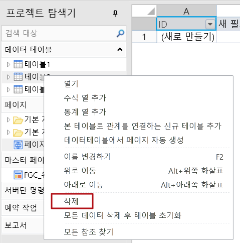 데이터 테이블에서 마우스 오른쪽 버튼 클릭하고 [삭제]를 선택하거나 Delete 키를 직접 눌러 데이터 테이블을 삭제합니다.