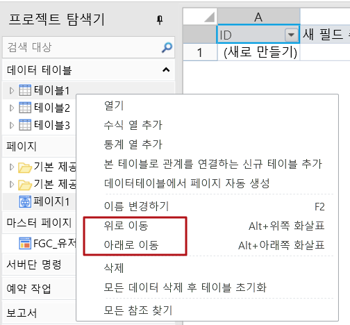 데이터 테이블을 선택하고 마우스 오른쪽 버튼을 클릭하거나, 위로 이동 또는 아래로 이동을 선택하거나, 키 조합 Alt+Up, Alt+Down을 사용하여 데이터 테이블의 위치를 이동할 수도 있습니다.