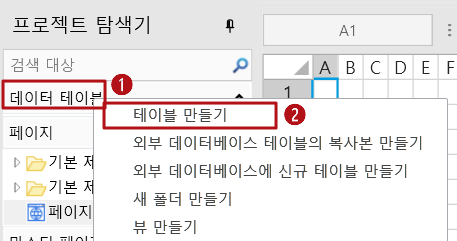 방법 2. 디자이너 개체 관리자 테이블 탭을 마우스 오른쪽 버튼을 클릭하고 팝업 메뉴에서 테이블 만들기를 선택합니다.
