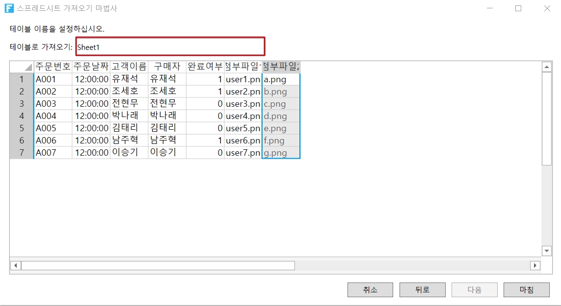 테이블 이름을 설정하고 [마침]을 클릭합니다.