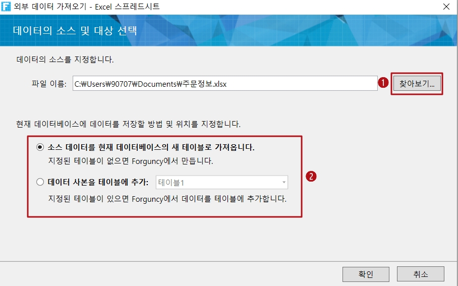 [찾아보기]를 클릭하고 가져올 Excel 파일을 선택한 다음 [확인]을 클릭합니다. 데이터가 현재 데이터베이스에 저장되는 방법과 위치를 지정할 수 있습니다.