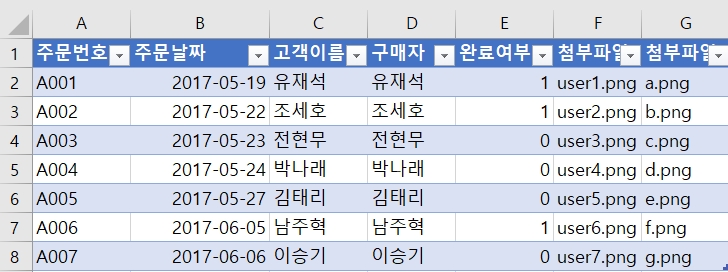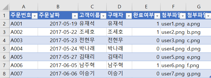 포건시는 Excel파일의 데이터를 가져와 데이터 테이블을 생성할 수 있도록 지원합니다. 예를 들어 포건시에서 다음 그림과 같이 Excel 파일을 사용하여 데이터 테이블을 만듭니다.