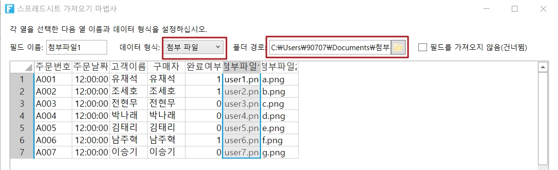 가져온 필드의 데이터 형식을 설정합니다. 필드를 선택하여 이름 및 데이터 형식을 수정합니다. 필드를 가져오지 않으려면 필드를 선택한 후 "필드 가져오기 않음(건너뜀)" 선택할 수도 있습니다.