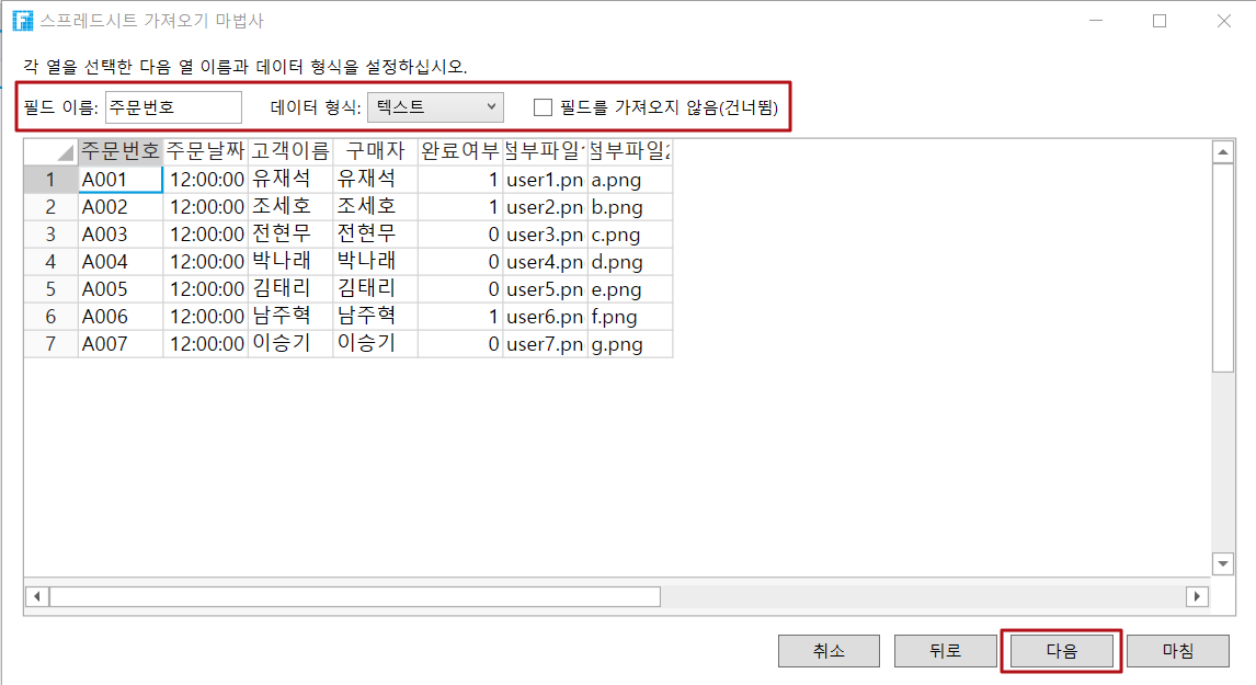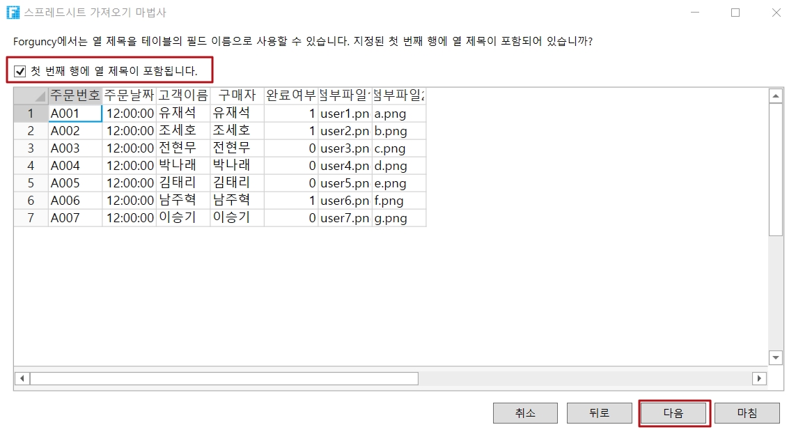 필드 이름을 설정합니다. 첫 번째 행의 셀 내용을 필드 이름으로 사용하려면 "첫 번째 행에 열 제목 포함됩니다."를 선택합니다.
