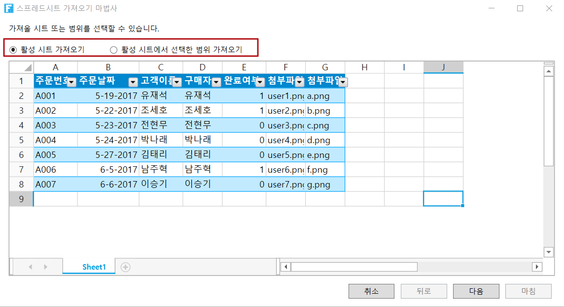 가져올 시트 또는 범위를 선택할 수 있습니다.
