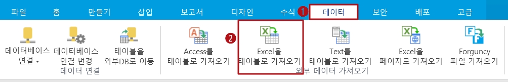 리본 메뉴 모음에서 [데이터]>[Excel을 테이블로 가져오기] 선택합니다.