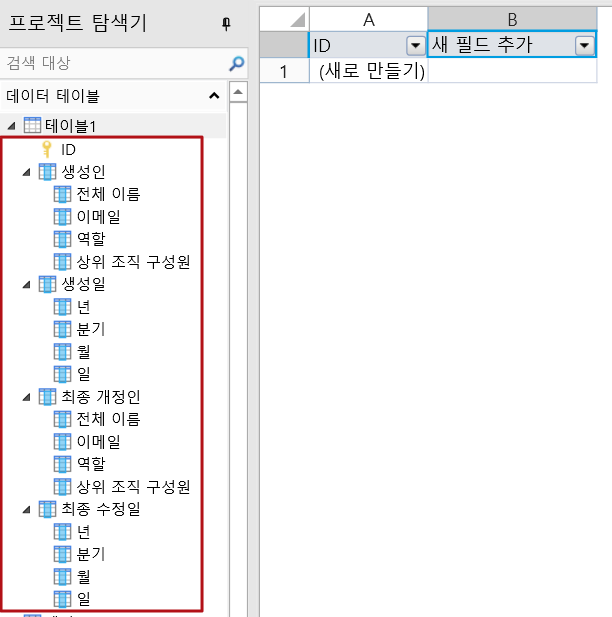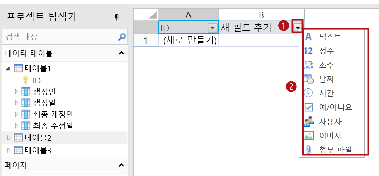 데이터 테이블에 필드를 만드는 단계는 다음과 같습니다.