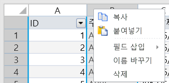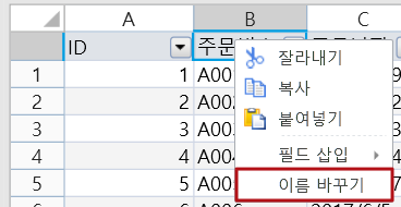 필드의 이름을 지정합니다.필드 이름이 있는 셀 마우스 오른쪽 버튼을 클릭하고 팝업 메뉴에서 [이름 바꾸기]를 선택하여 필드 이름을 수정합니다. 필드 이름이 있는 셀을 두 번 클릭하여 필드 이름을 수정할 수도 있습니다.