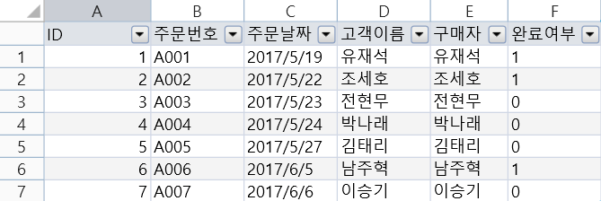 아래 그림의 주문 테이블에는 ID, 주문 번호, 주문 날짜, 고객 이름, 구매자 및 완료 여부에 대한 6개의 필드와 7개의 레코드가 있습니다. 여기서 ID는 자체 증가 필드이며 편집할 수 없습니다.