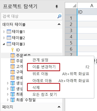 데이터 테이블을 확장하고 필드를 선택하고 마우스 오른쪽 버튼을 클릭한 다음 마우스 오른쪽 버튼 메뉴에서 "이름 변경하기" 및 "삭제"를 선택할 수도 있습니다.